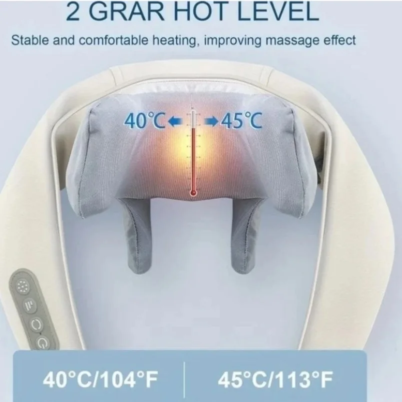 سرهای ماساژ با روکش سیلیکونی نرم طراحی شدهاند تا در کنار قدرت بالا، تماس ملایم و ایمنی با پوست داشته باشند. وجود کمپرس حرارتی دوحالته باعث افزایش گردش خون، کاهش درد و آرامش بیشتر عضلات میشود.