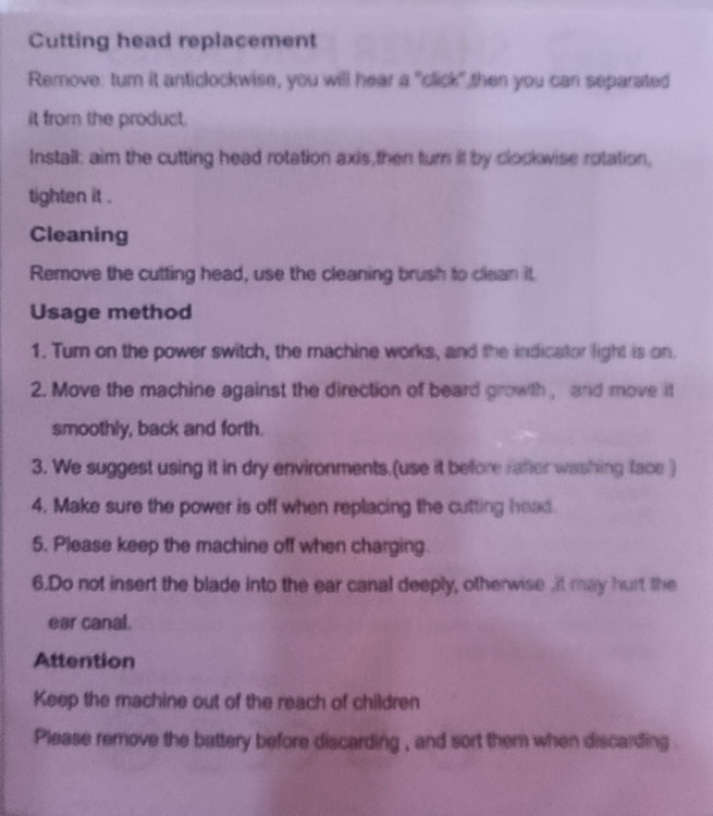 5. توصیه ایمنی: در حین شارژ دستگاه را خاموش نگه دارید. از ورود تیغه به مجرای گوش خودداری کنید. دور از دسترس کودکان.