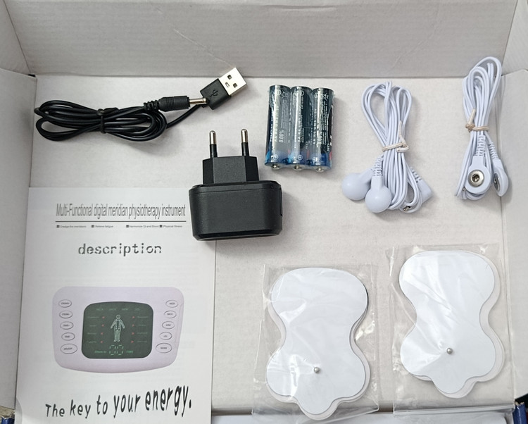 آداپتور و کابل ،۴ عدد پد فیزیوتراپی,سه عدد باتری قلمی, دو عدد کابل فیزیوتراپی جفتی، دفترچه راهنما