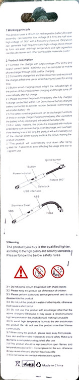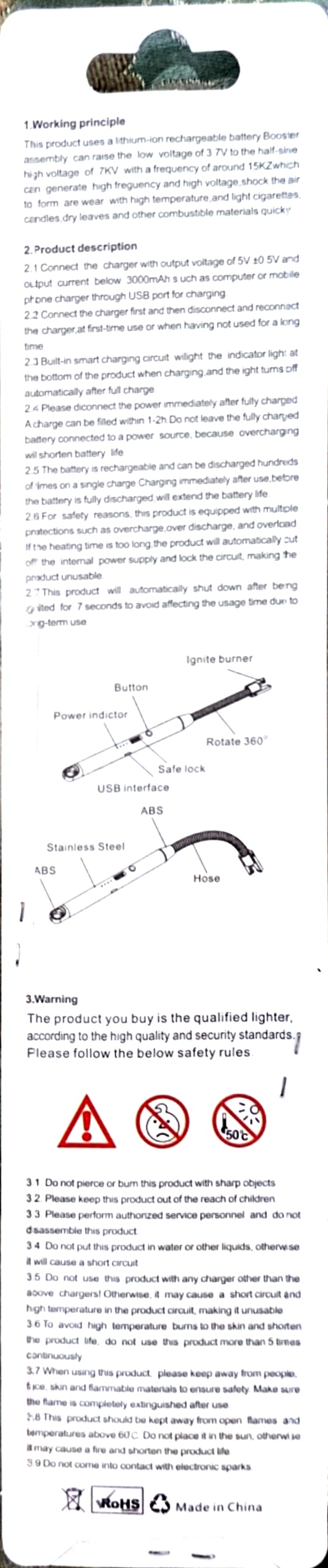 فندک برقی پلاسمایی دستهبلند USB یک فندک بدون گاز است که با استفاده از باتری لیتیومی داخلی و ایجاد جرقه پلاسمایی، شعلهای پایدار و ایمن تولید میکند. روی بستهبندی موارد زیر ذکر شده است:
